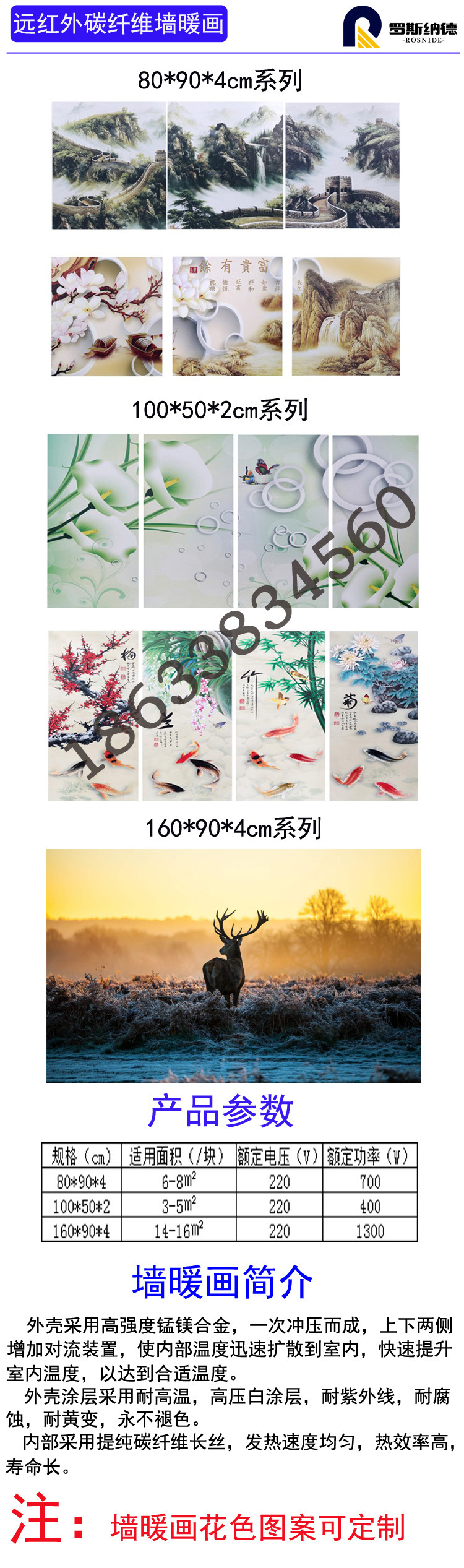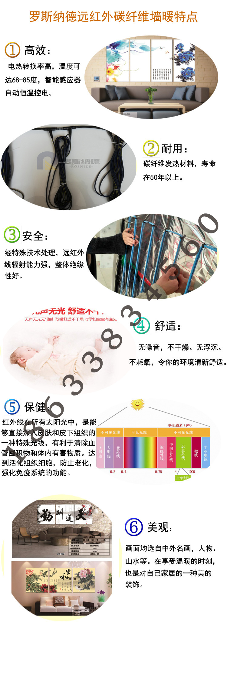 画面采用现在先进的UV打印技术打印画面,外壳采用钛镁合金铝板,里面用的碳纤维发电话通电后表面温度控制在90度,通过室内空气对流进行室内加热。